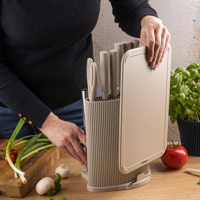 Kompaktne noaalus pakub organiseeritud hoiuruumi kõigile teie nugadele, kääridele ja lõikelauale. Integreeritud paberrätikute hoidik tagab, et teie köögirätikud on alati käepärast. See ruumisäästlik disain hoiab teie tööpinna puhta ja korras.