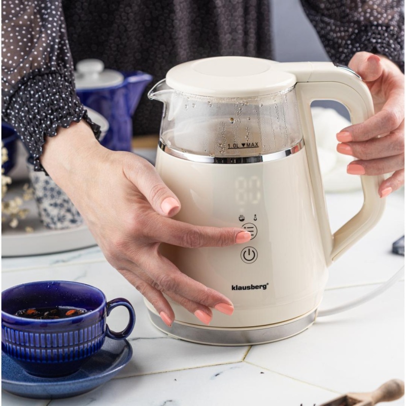 Klausberg KB-7893 elektriline veekeetja on elegants ja tehnoloogia ühes seadmes. Oma ainulaadse kreemikas värvilise disaini ja klaasist korpusega saab sellest stiilne aktsent igas köögis ning selle täiustatud funktsioonid võimaldavad teil valmistada mis tahes jooki ideaalsel temperatuuril, kiiresti ja vaevata.